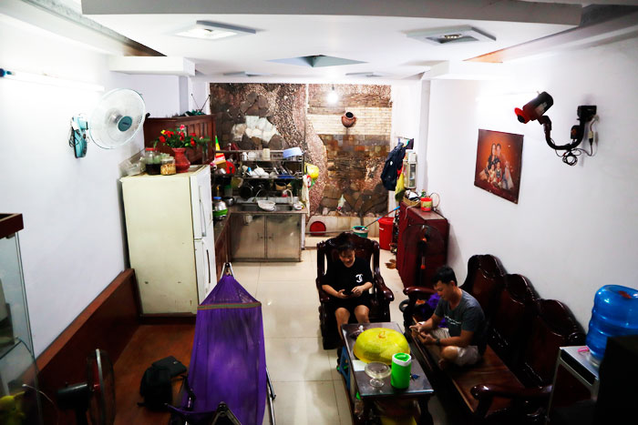 Tầng trệt chia làm 3 đoạn, phía trước đang cho thuê kinh doanh, đoạn giữa tầng trệt để xe và phòng thờ, đoạn sau là nhà bếp và khu vực sinh hoạt chung của gia đình.